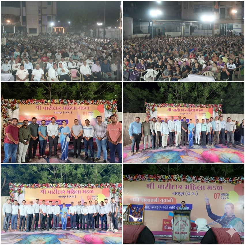 શ્રી પાટીદાર મહિલા મંડળ, રાયપુર દ્વારા આયોજિત આ પ્રેરણાત્મક કાર્યક્રમ. સર્વપ્રથમ વક્તવ્ય પહેલા લવજીહાદ ઉપર સમાજ ની દિકરીયો દ્વારા સરસ પ્રસ્તુતિ કરેલ ત્યાર બાદ પ્રેરણાદાયી વ્યાખ્યાન કાર્યક્રમમાં સમસ્ત જ્ઞાતિ જનો શ્રી મતી કાજલબેન હિન્દુસ્તાની નું વક્તવ્ય સમાજ ના હર એક વકતી અને બહેન સાથે દિકરી ના જીવન માં લાભદાયી થાય એવું બેન દ્વારા પીરસવા માં આવેલ હતું. સનાતની શ્રી મતી કાજલ હિન્દુસ્તાની દ્વારા વક્તવ્ય માં કહેલું કે સમાજ ના બાળકો ને સંસ્કાર આપવા અને આત્મરક્ષણ કેવી રીતે કરવું અને દિકરીઓ ને આજ ના જુગ માં અધર્મીઓ દ્વાર સડયંત્ર ચાલવામાં આવે છે તેના થી કેમ બચવું તેનું માર્ગદર્શન આપવામાં આવ્યું. સનાતની શ્રી મતી કાજલ હિન્દુસ્તાની દ્વારા સમાજ જનો ને સંકપ અપાયો છે કે સમાજ અથવા માંગલિક કારેક્રમ માં મુસલમાન થી વહેવાર ના કરવો જોઈએ અને વિવિધ સારા હિન્દૂ સંગઠન થી જોડાલું રેવું જોયે સાથે સમાજ ના સર્વે સદસ્યો થી આગ્રકરેલ જીવન મા અધ્યાત્મિકતા નું કેટલું મહત્વ છે સાથે એનુ માર્ગદર્શન આપેલ અને આયોજિત કારેક્રમ માં અંદાજીત 2000 લોકો સમસ્ત વડીલો ,માતાઓ,ભાઈઓ,બહેનો,યુવા ધન ઉપસ્થિત રહયા હતા. શ્રી ABKKP કેન્દ્રિય સમાજ ના ટ્રસ્ટી, શ્રી ABKKP સમાજ છત્તીસગઢ ઝોન સમાજ હોદ્દેદાર અને કારોબારી ટીમ, છત્તીસગઢ રિજિયન ના પ્રમુખ યોગેશ ભાઈ છાભૈયા અને હોદેદારો અને કારોબારી સભ્ય સાથે સલાકાર,કેન્દ્રીય પ્રતિનિધિ,ફોરેસ્ટ કોઉન્સિલ PDO ઉપસ્થિત રહ્યા હતા, છત્તીસગઢ રિજિયન ના વિવિધ સમિતિ અને થીમ ના કન્વીનોર અને સહકન્વીનોર સભ્ય ઉપસ્થિત રહ્યા હતા, શ્રી રાયપુર પાટીદાર સમાજ રાયપુર ના પ્રમુખ શ્રી વિશ્રામ ભાઈ છાભૈયા અને એમની સંપૂર્ણ હોદ્દેદાર અને કારોબારી ટીમ, શ્રી રાયપુર મહિલા મંડળ ના પ્રમુખ શ્રીમતી મંજુબેન છાભૈયા અને એમની સંપૂર્ણ હોદ્દેદાર અને કારોબારી ટીમ, શ્રી ABKKP સમાજ છત્તીસગઢ ઝોન મહિલા મંડળ પ્રમુખ શ્રી શકુન્તલા બેન નાકરાણી અને એમની હોદ્દેદાર અને કારોબારી ટીમ, શ્રી રાયપુર યુવા મંડળ પ્રમુખ શ્રી હરસુખ નાથાણી અને એમની સંપૂર્ણ હોદ્દેદાર અને કારોબારી ટીમ.